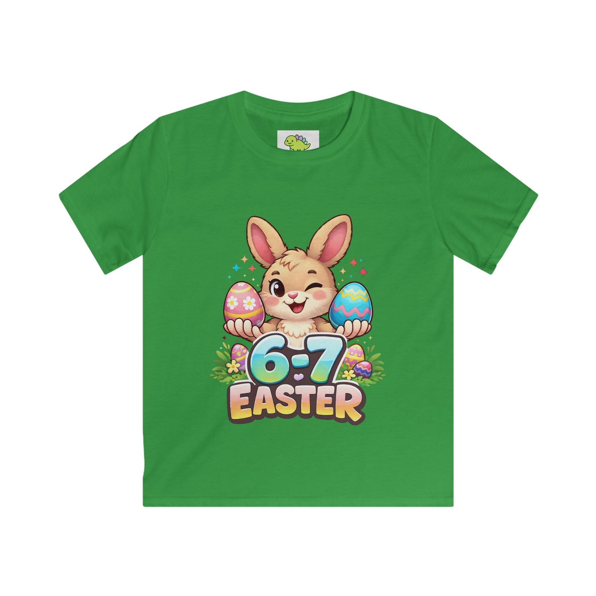 Make Easter stand out with this adorable and vibrant bunny tee! Featuring a playful bunny holding colourful Easter eggs with bold “6–7 Easter” lettering, this design pops beautifully on a classic t-shirt.